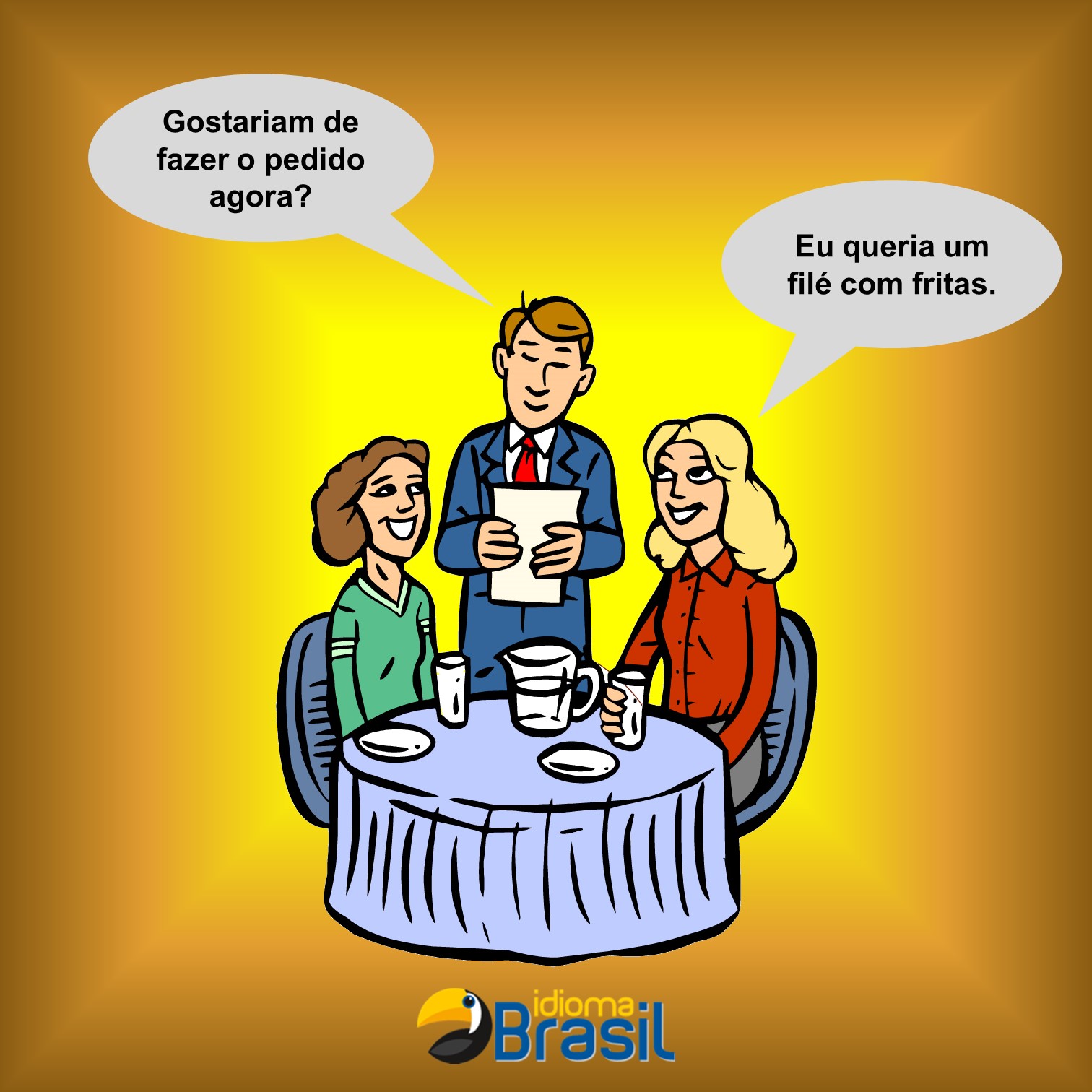 No restaurante 21/10/1407/06/16 | Tamara Krzonkalla Olá! Hoje, uma situação no restaurante. Garçom: “Gostariam de pedir agora?” / “Gostariam de fazer o pedido agora?” Cliente: “Eu queria…” / “Eu gostaria de…” / “Por favor, …” Boa terça-feira a todos! 🙂 Compartilhe: Clique para compartilhar no X(abre em nova janela) 18+ Clique para compartilhar no Facebook(abre em nova janela) Facebook Clique para compartilhar no WhatsApp(abre em nova janela) WhatsApp Clique para compartilhar no Tumblr(abre em nova janela) Tumblr Clique para compartilhar no Pinterest(abre em nova janela) Pinterest Clique para compartilhar no LinkedIn(abre em nova janela) LinkedIn Clique para enviar um link por e-mail para um amigo(abre em nova janela) E-mail Clique para imprimir(abre em nova janela) Imprimir Relacionado